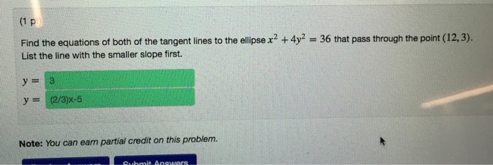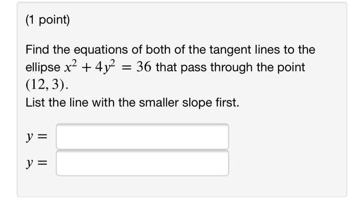 Solved Find The Equations Of Both Of The Tangent Lines To The Ellipse X 2 4y 2 36 That Pass Through The Point 12 3 List The Line With The Smaller Course Hero